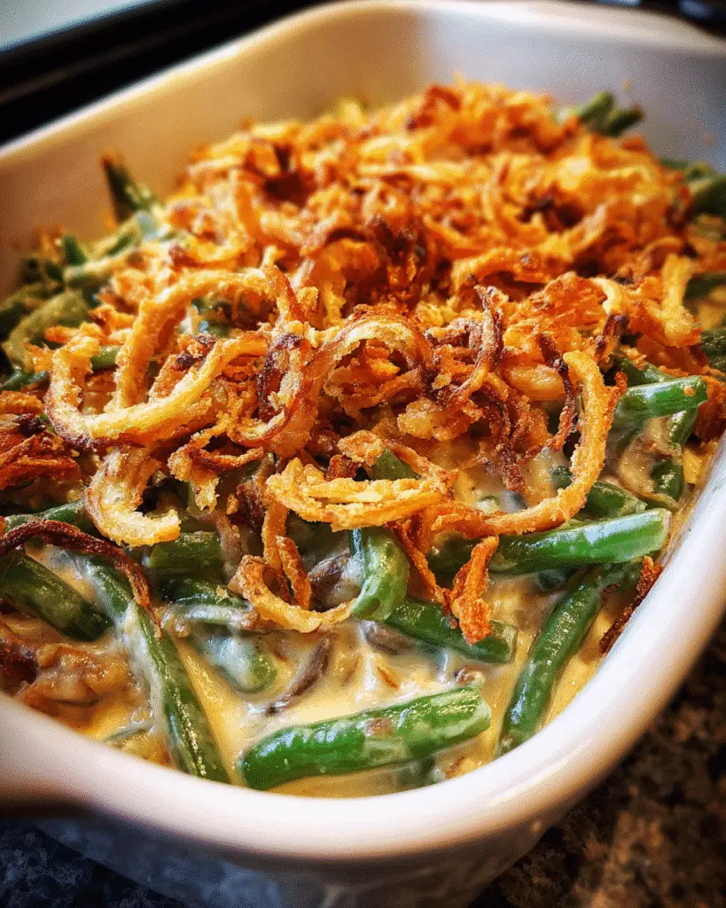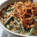 A classic American side dish featuring tender green beans, creamy mushroom soup, and crispy fried onions.