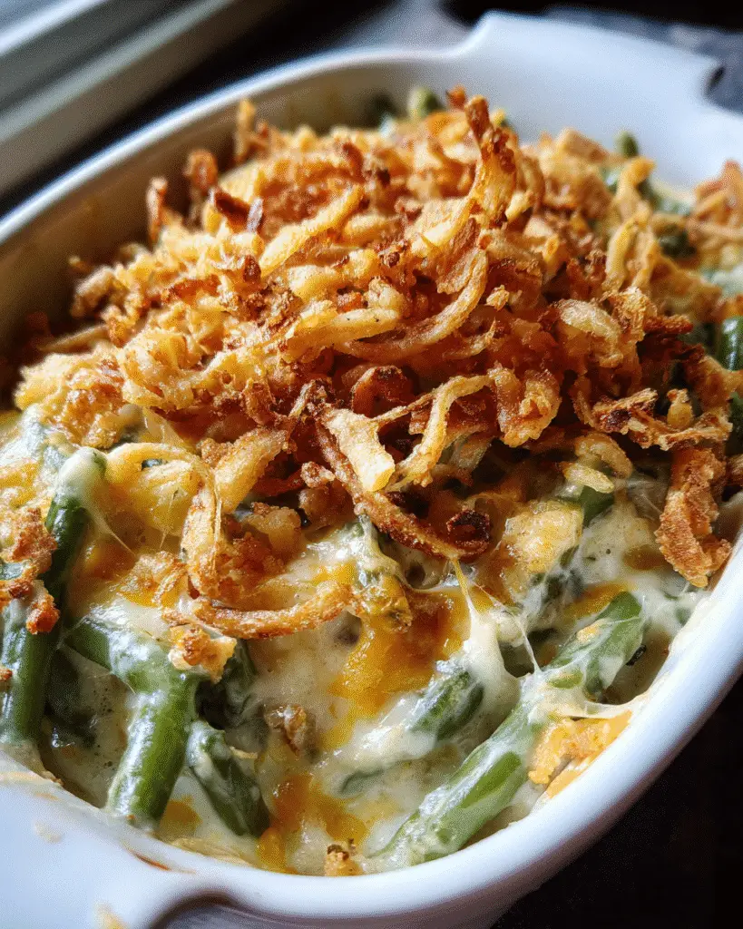 A creamy and cheesy casserole with green beans, topped with a golden crust. Perfect for holidays or any gathering.