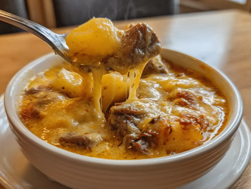 A hearty and comforting soup with tender beef, potatoes, and melted cheese.