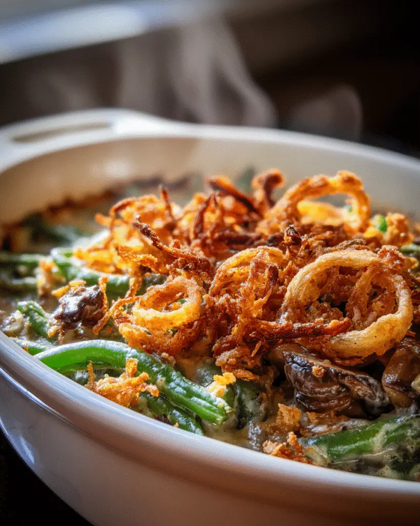 A simple and delicious green bean casserole made with fresh ingredients and topped with crispy fried onions.