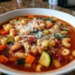 Oh, let me tell you how I love to serve this minestrone – it’s all about the perfect accompaniments! First, crusty bread is non-negotiable in my house – whether it’s a warm baguette or garlic toast for dipping into that flavorful broth. And don’t even get me started on the extra Parmesan – I keep a whole block at the table so everyone can grate their own snowy pile on top. For a little something extra, I sometimes add a drizzle of good olive oil or a sprinkle of red pepper flakes for those who like heat. Trust me, with these simple touches, your minestrone transforms into a restaurant-worthy meal!