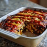 Now grab your baking dish (I use a 9×13 inch, but anything similar works). Pour about 1/2 cup of enchilada sauce to coat the bottom – just enough to prevent sticking. Here comes the fun part: layer 4 quartered tortillas over the sauce (they’ll overlap, and that’s perfect). Spoon half your bean mixture on top, then drizzle with another 3/4 cup sauce. Repeat with the remaining tortillas, beans, and sauce. Pro tip: don’t drown it in sauce – you want distinct layers, not a soggy mess!